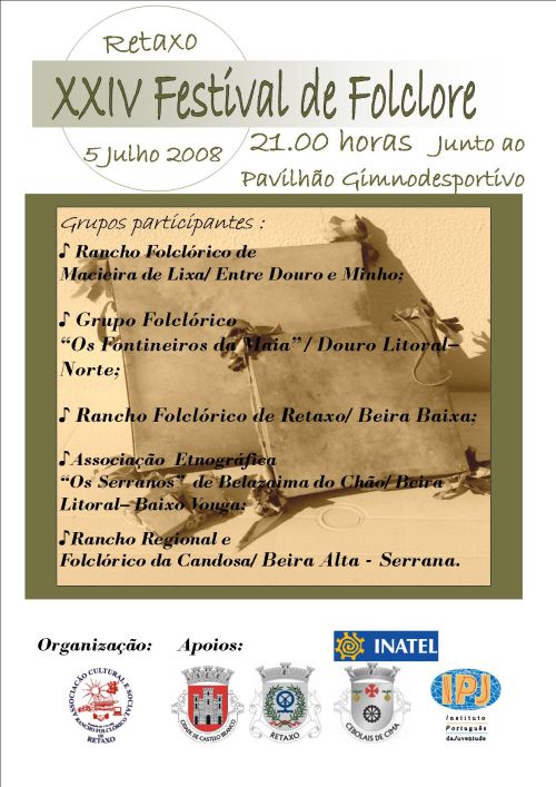 Julho 7, 2008Julho 13, 2008 Francisco Faísca XXIV Festival de Folclore de Retaxo Cartaz do Festival Realizou-se no passado dia 5 de Julho de 2008 o XXIV Festival de Folclore de Retaxo com a participação de grupos de vários pontos do País. Desta feita o nosso grupo levou a cabo pela primeira vez a recriação de uma romaria. Partilhe isto: Imprimir (Abre numa nova janela) Imprimir Share on X (Abre numa nova janela) X Email a link to a friend (Abre numa nova janela) E-mail Partilhar no Facebook (Abre numa nova janela) Facebook Gosto Carregando... Relacionado