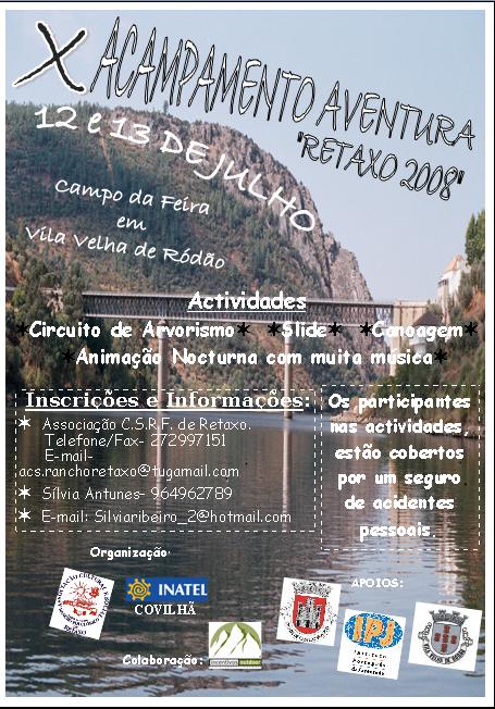 O X Acampamento Aventura “Retaxo 2008” irá realizar-se nos dias 12 e 13 de Julho e contará com diversas actividades como circuito de Arvorismo, canoagem e muitas outras. Poderás contar com muita animação e muitas actividades desportivas. Podes inscrever-te na sede da Associação ou mandando um email para os emails indicados.