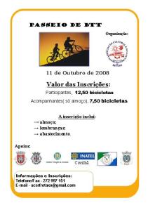 No dia 11 de Outubro irá realizar-se um passeio de BTT organizado pela nossa Associação. Todos os inscritos terão direito a almoço, abastecimento e lembranças de participação. Para os participantes o preço da inscrição será de 12,50 bicicletas e para os acompanhantes será de 7,50 bicicletas. Esta inciativa tem o apoio da Câmara Municipal de Castelo Branco, Câmara Municipal de Vila Velha de Ródão, IPJ, INATEL da Covilhã, Associação de Ciclismo e Cicloturismo de Castelo Branco e Junta de Freguesia de Retaxo.