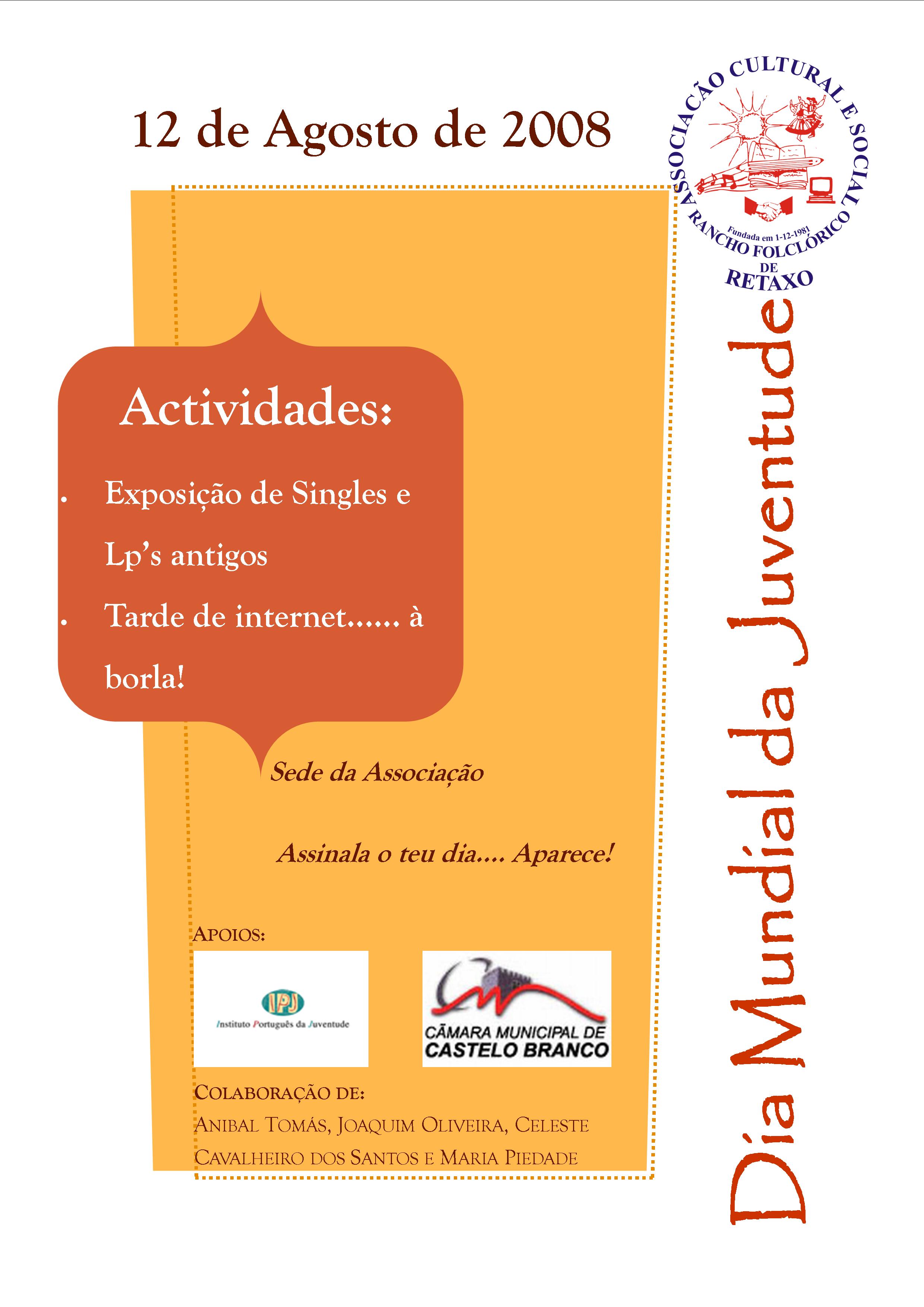 Agosto 12, 2008 littlejohn1111 Dia Mundial da Juventude Dia 12 de Agosto comemora-se o Dia Mundial da Juventude. A nossa Associação vem assinalando o mesmo já há alguns anos. Este ano realizamos duas iniciativas: uma exposição de LP´s e Singles e uma tarde de internet grátis para todos. Partilhe isto: Imprimir (Abre numa nova janela) Imprimir Share on X (Abre numa nova janela) X Email a link to a friend (Abre numa nova janela) E-mail Partilhar no Facebook (Abre numa nova janela) Facebook Gosto Carregando... Relacionado