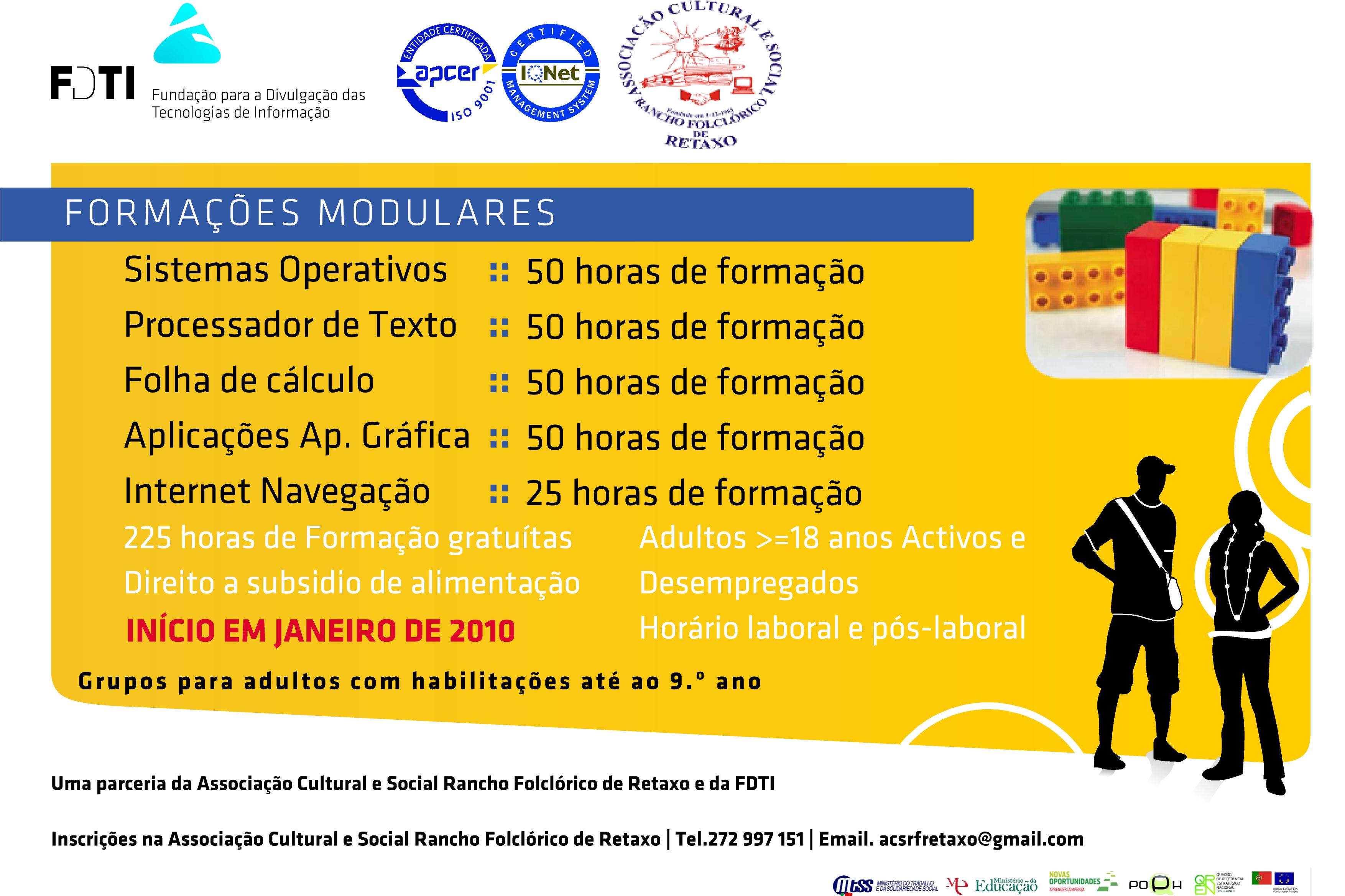 Iniciada já à alguns anos, a parceria entre a ACSRF de Retaxo e a Delegação Distrital da FDTI continua a dar frutos. Na longo de todos estes anos, foram algumas centenas os que através da mesma adquiriram conhecimentos na área das novas tecnologias, um verdadeiro combate à info-exclusão. Mas esta colaboração mútua vai manter-se. Assim, e para que todos os que não possuem formação nesta área a possam adquirir, encontram-se abertas as inscrições para um grupo de 12 formandos, que, em horário pós-laboral, à noite, estejam interessados em frequentar os 5 módulos. As inscrições, para indivíduos de ambos os sexos, e com habilitações até ao 9º ano, efectuam-se na sede, são gratuitas, e conferem para além dos respectivos certificados (caso se verifique avaliação positiva), o subsídio de alimentação por cada dia de formação frequentada.