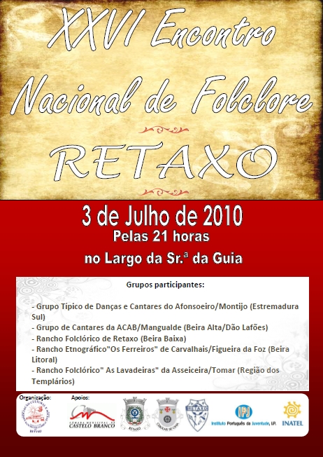 Junho 25, 2010 Francisco Faísca 26º Encontro Nacional de Folclore de Retaxo Partilhe isto: Imprimir (Abre numa nova janela) Imprimir Share on X (Abre numa nova janela) X Email a link to a friend (Abre numa nova janela) E-mail Partilhar no Facebook (Abre numa nova janela) Facebook Gosto Carregando... Relacionado