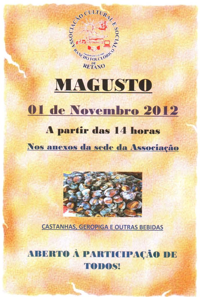 Outubro 14, 2012Outubro 27, 2012 Francisco Faísca Magusto – Dia 1 de Novembro Actividades de dia 1 de Novembro de 2012 Partilhe isto: Imprimir (Abre numa nova janela) Imprimir Share on X (Abre numa nova janela) X Email a link to a friend (Abre numa nova janela) E-mail Partilhar no Facebook (Abre numa nova janela) Facebook Gosto Carregando... Relacionado