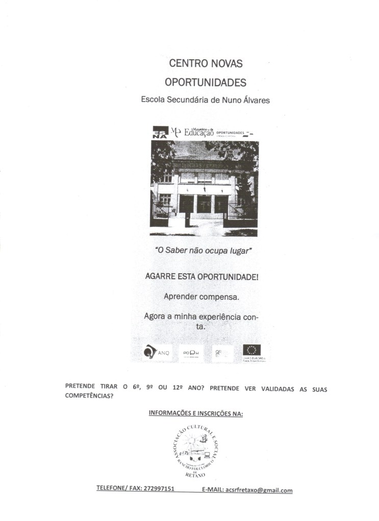 Outubro 27, 2012 Francisco Faísca Inscrições para Novas Oportunidades Partilhe isto: Imprimir (Abre numa nova janela) Imprimir Share on X (Abre numa nova janela) X Email a link to a friend (Abre numa nova janela) E-mail Partilhar no Facebook (Abre numa nova janela) Facebook Gosto Carregando... Relacionado